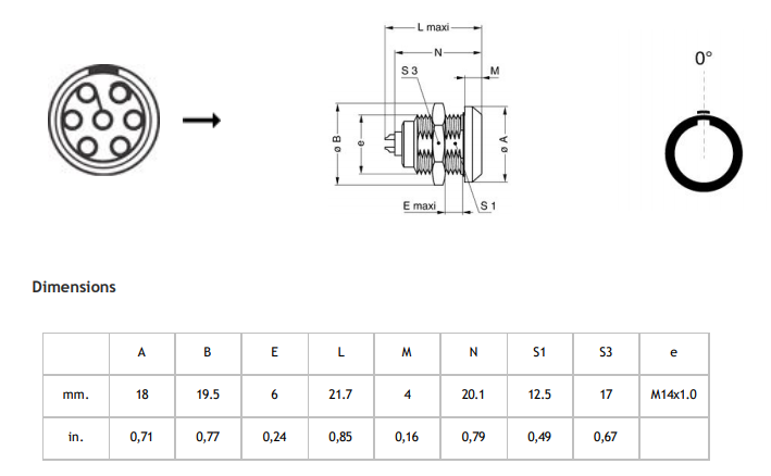 Keying | 1 key (alpha=0, plug: male contacts, receptacle: female contacts) |